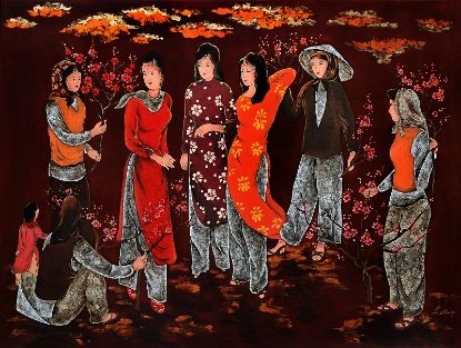 Lê Thy. Tranh sơn mài đích thực. Vẽ phủ mài nhiều lớp theo kỹ thuật Việt Nam. Nhìn bao quát, tổng thể bức tranh. Chất liệu được xử dụng để thực hiện ta thấy có sơn ta, vàng bạc dát mỏng, vỏ trứng, màu son, màu xanh lá. Chất liệu sơn ta, vàng bạc là chủ đạo chiếm khoảng tám mươi phần trăm bề mặt của tác phẩm. Ta có thể mạnh dạn khẳng định. Đây là một tác phẩm sơn mài đích thực, có đầy đủ các chất liệu truyền thống và mang tính nghệ thuật rất cao, không phải là loại sản phẩm mỹ nghệ, như mọi người thường nghĩ khi nghe nói đến sơn mài.