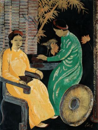Lê Thy. Tranh sơn mài đích thực. Vẽ phủ mài nhiều lớp theo kỹ thuật Việt Nam. Nhìn bao quát, tổng thể bức tranh. Chất liệu được xử dụng để thực hiện ta thấy có sơn ta, vàng bạc dát mỏng, vỏ trứng, màu son, màu xanh lá. Chất liệu sơn ta, vàng bạc là chủ đạo chiếm khoảng tám mươi phần trăm bề mặt của tác phẩm. Ta có thể mạnh dạn khẳng định. Đây là một tác phẩm sơn mài đích thực, có đầy đủ các chất liệu truyền thống và mang tính nghệ thuật rất cao, không phải là loại sản phẩm mỹ nghệ, như mọi người thường nghĩ khi nghe nói đến sơn mài.